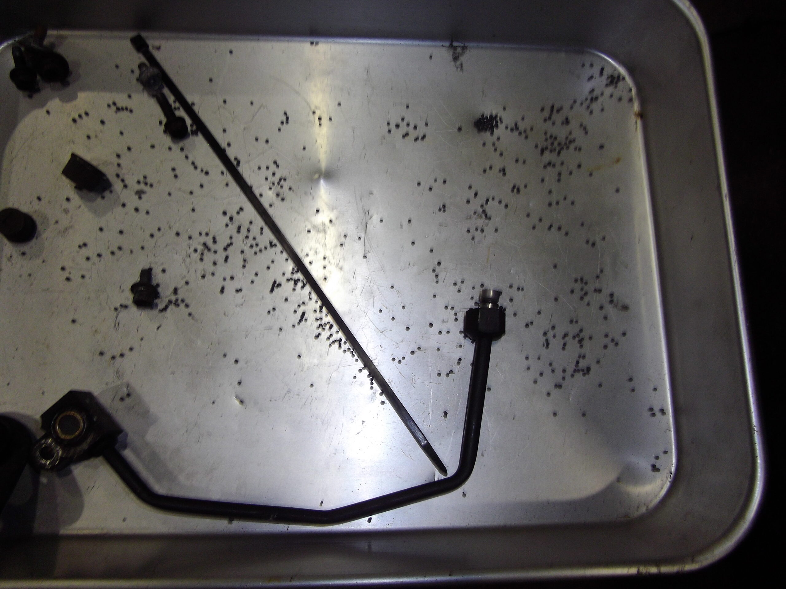 レシーバー内の乾燥剤が流出し、パイプライン、エキスパンションバルブまで詰まってました。かろうじてエキスパンションバルブで球が通れず詰まってくれたおかげでエバポレーター内までは回ってなかったです。