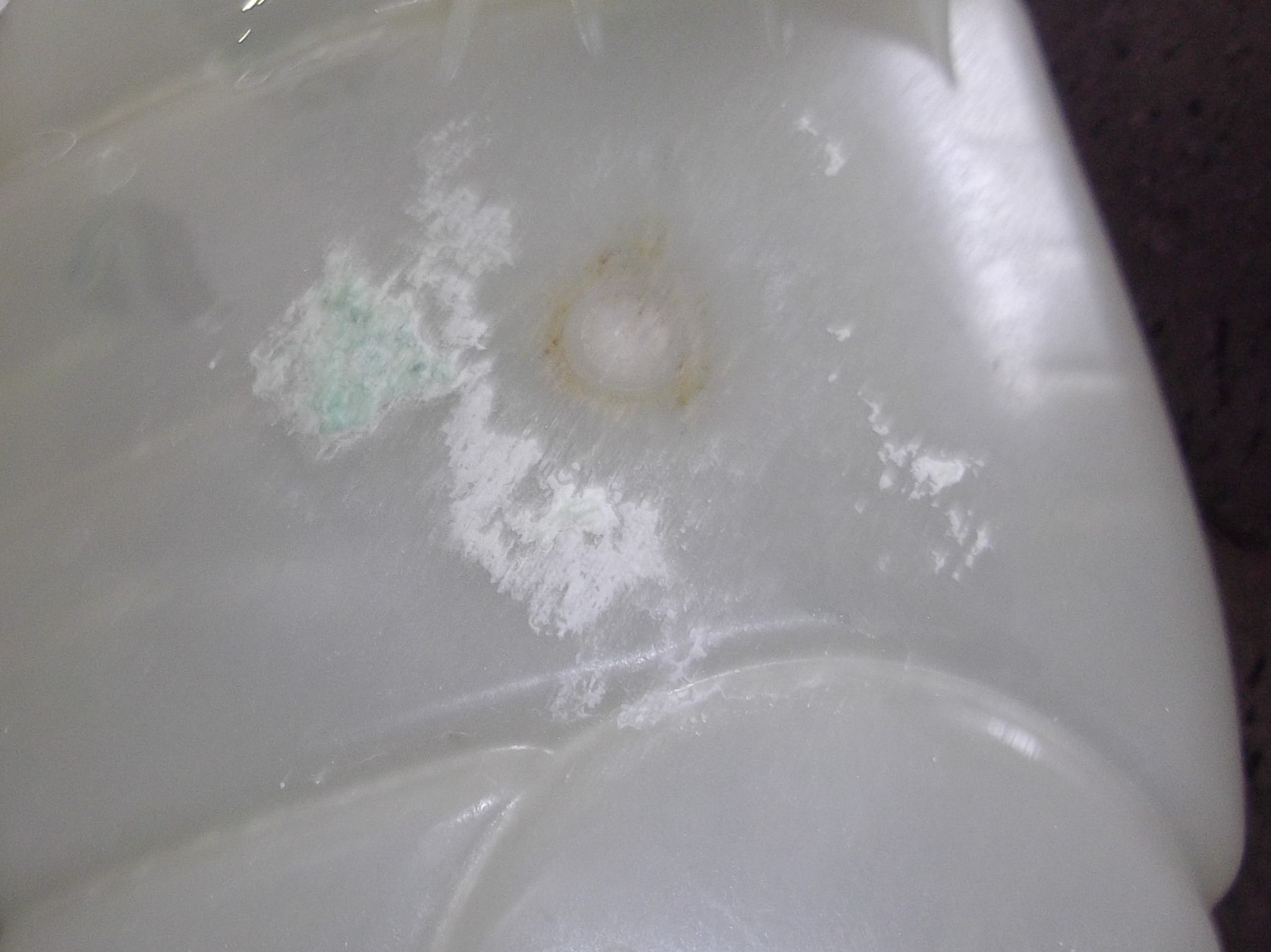 タンクの裏おへそ?みたいなところを中心にひび割れています。タンクとキャップを交換、冷却水を補充し作業完了\^o^/