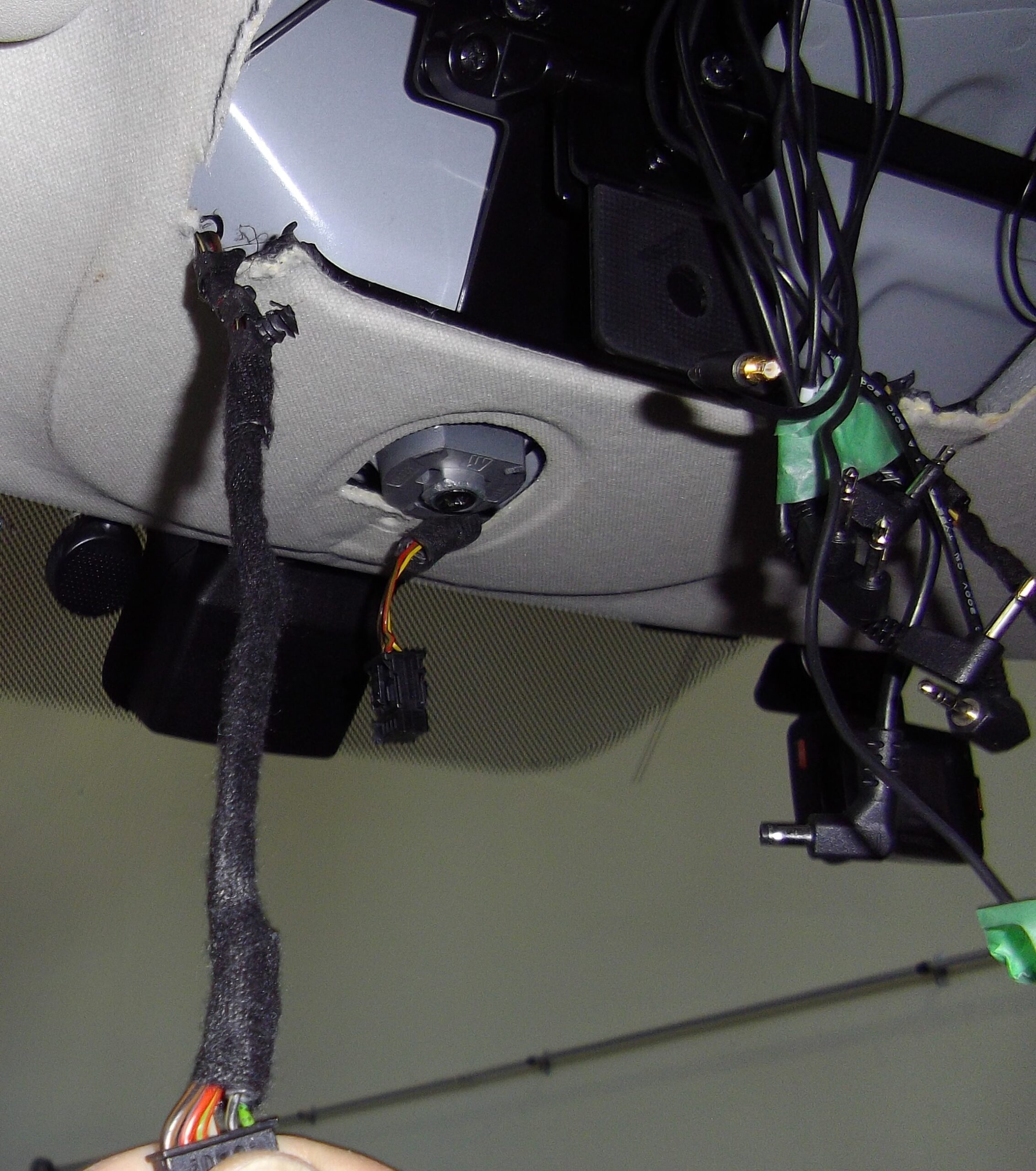ルームランプ下にルーフをくり抜いてモニターの土台がつけられ、モニターを固定し取り付けられており、ぼやけて見ずらいですが取付時に配線を噛みこんだまま取り付けつぶれ被膜が裂けイルミネーションの電源が流れ表示灯が点灯したままでした(;´༎ຶД༎ຶ`)