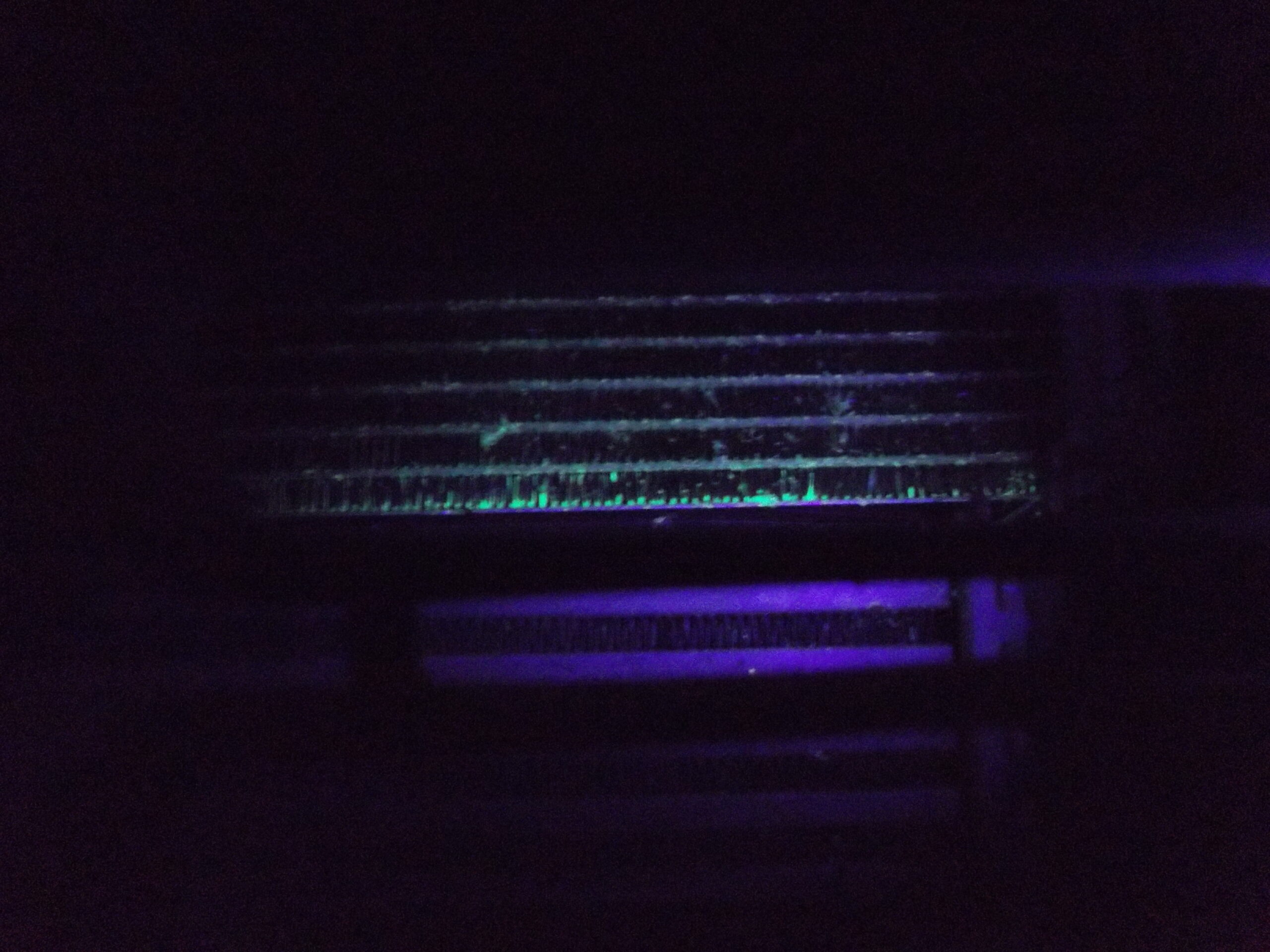 次はエアコン点検です。ガス漏れの為エアコンが効かなかったので、ガスが無色透明無臭の為、前回ガスと一緒に蛍光剤を入れたので今回は漏れチェックです。