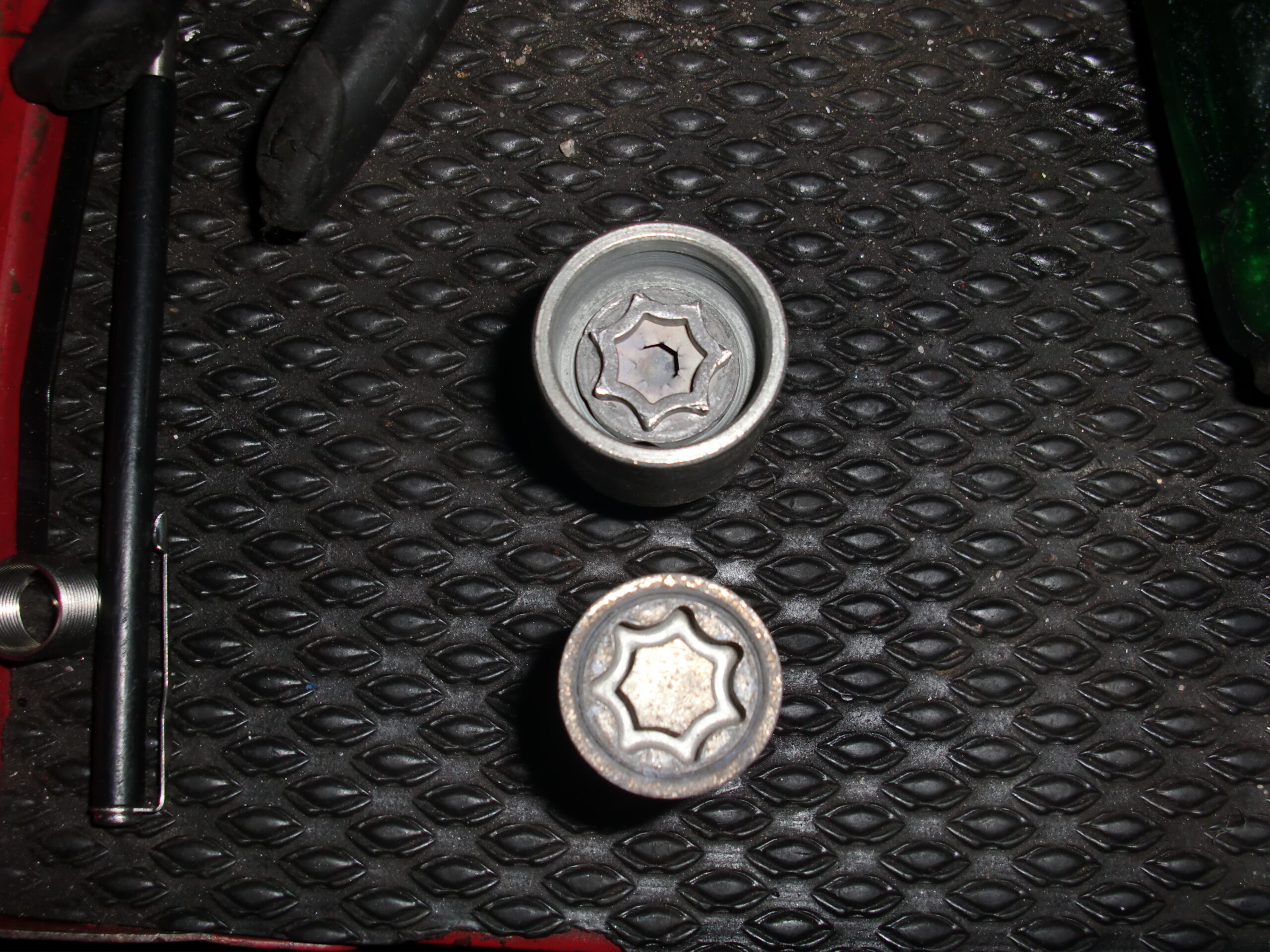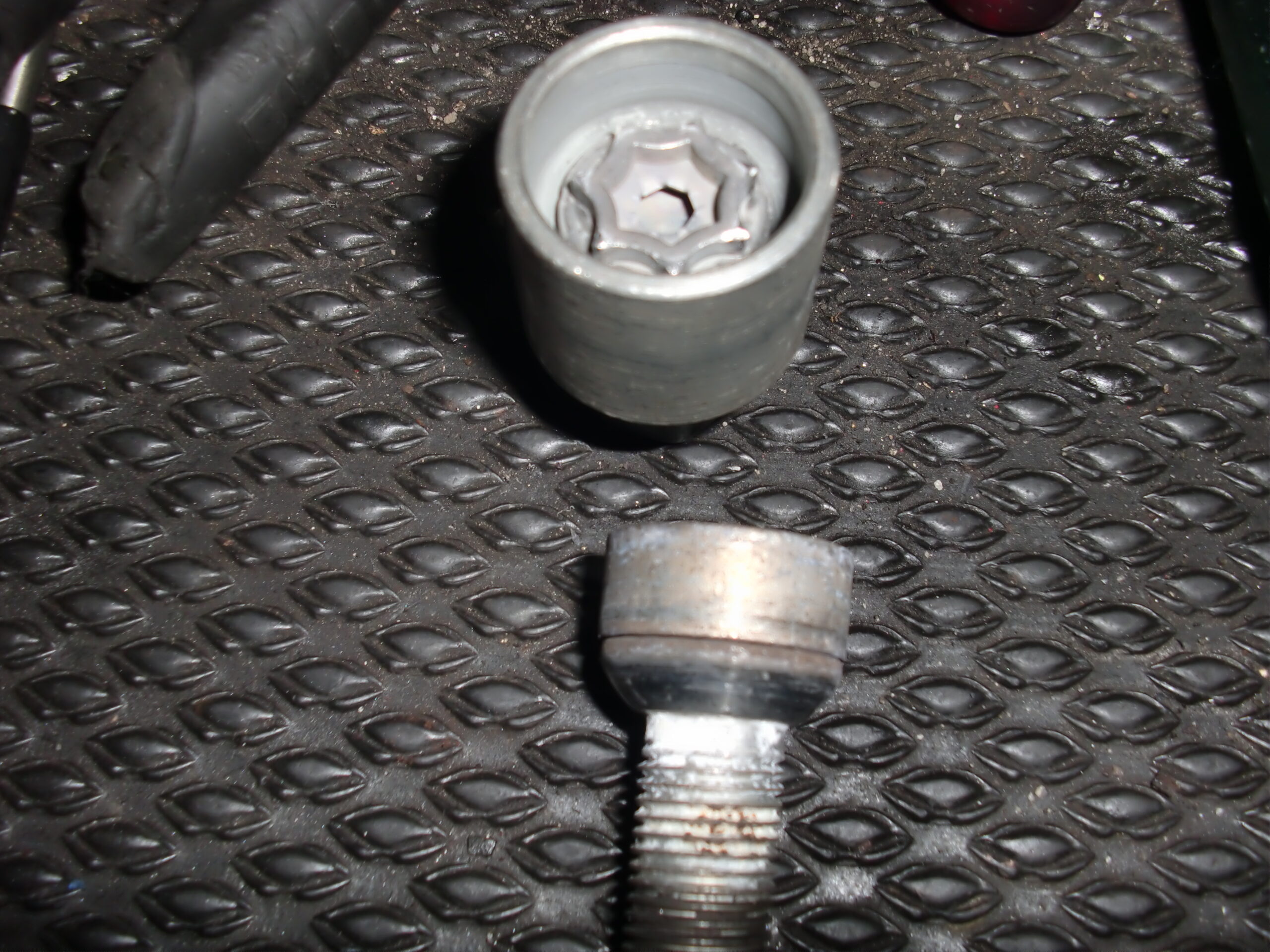 AUDI VWのロックボルトがなめってしまい、工具がかからなくなってしまったら取り外しが厄介で、なめったボルトを外すソケットを打ち込んで回しても外周だけ空回りする構造の為、ホイールを傷つけてしまうリスクと結構な労力をかけて外さなければなりません(;´༎ຶД༎ຶ`)