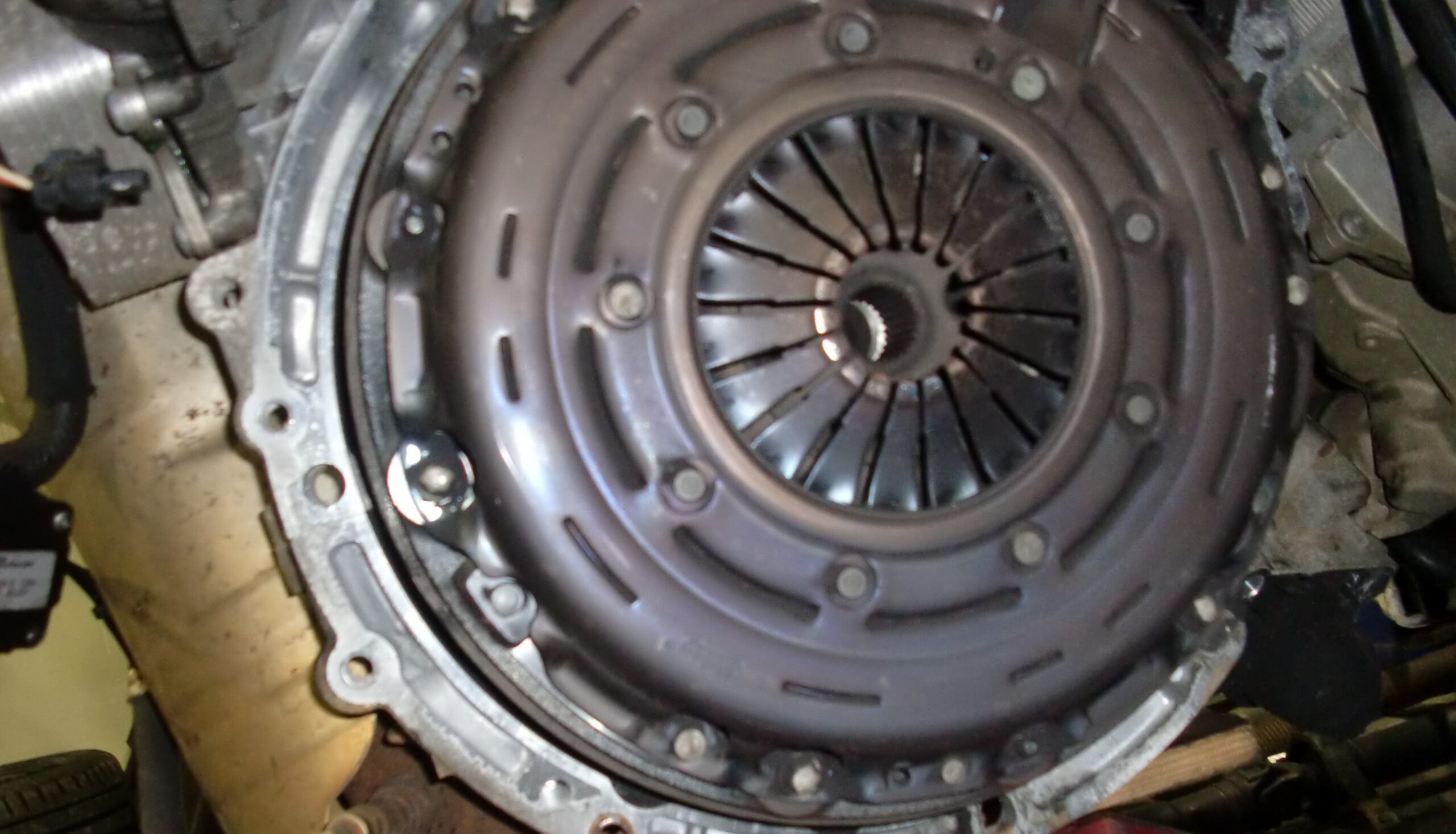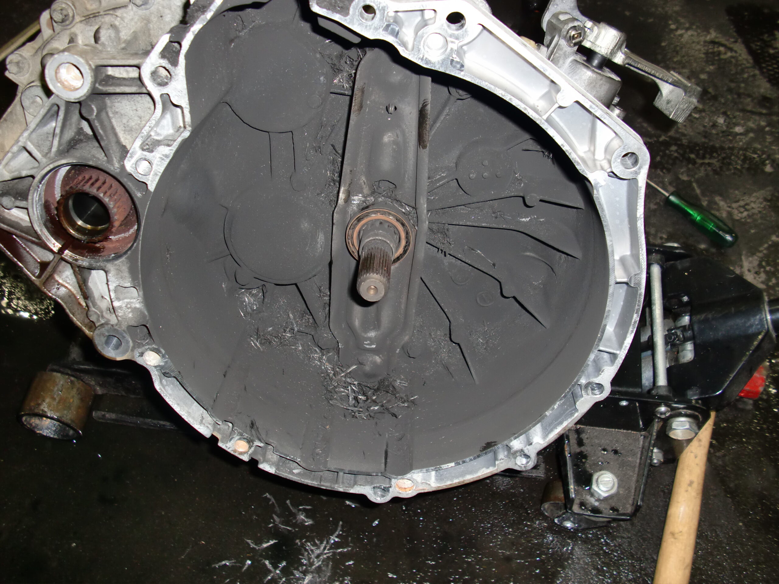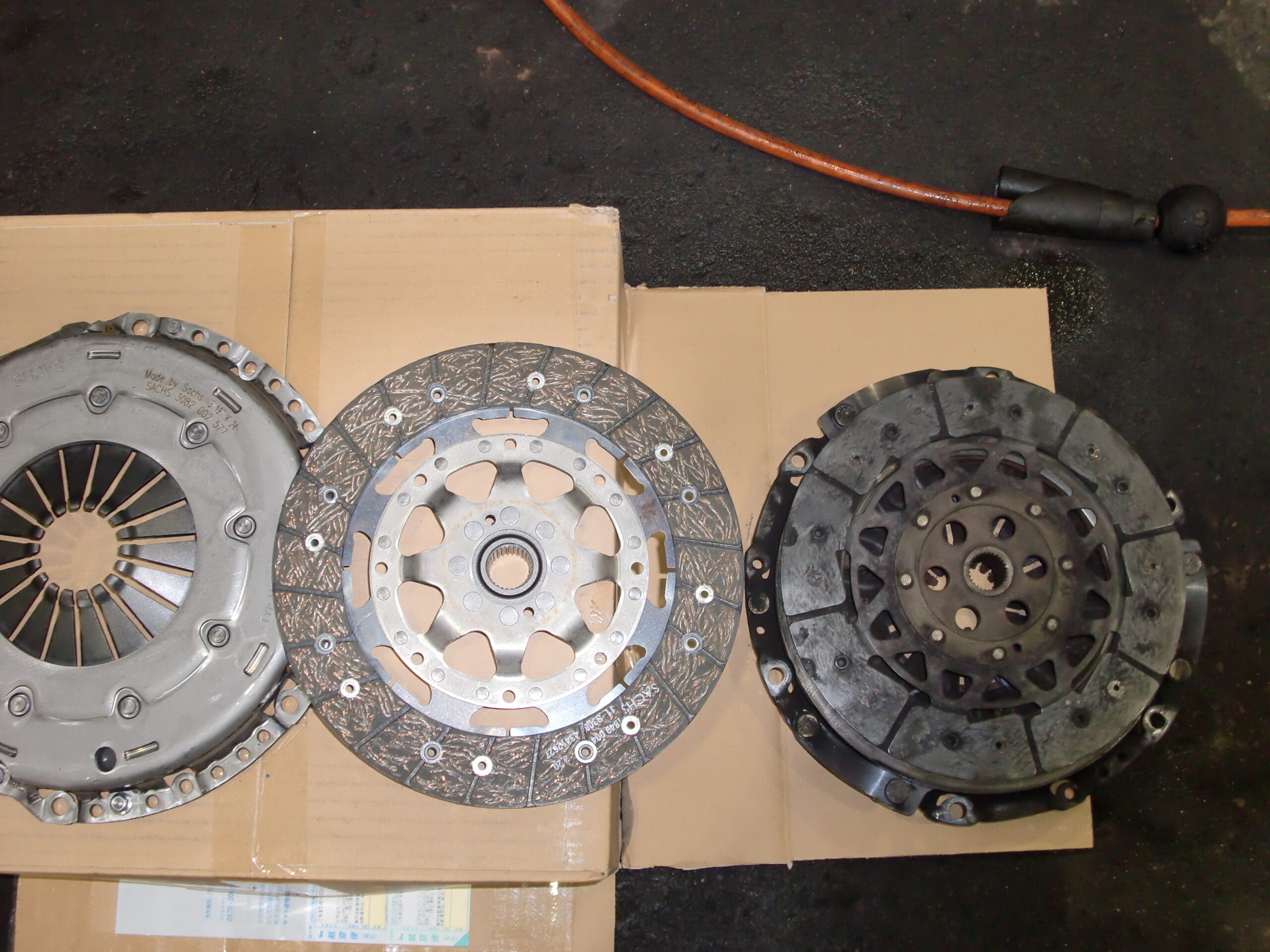 確実に動力が伝わっていないのでクラッチディスクの摩耗破損 クラッチカバーの劣化衰損 最悪トランスミッションの内部又はメーンドライブシャフト折損が考えられる為一度ミッションを外さなければ特定できない旨をご説明し、クラッチ一式だけをご用意出来次第作業に取り掛からせて頂きました。