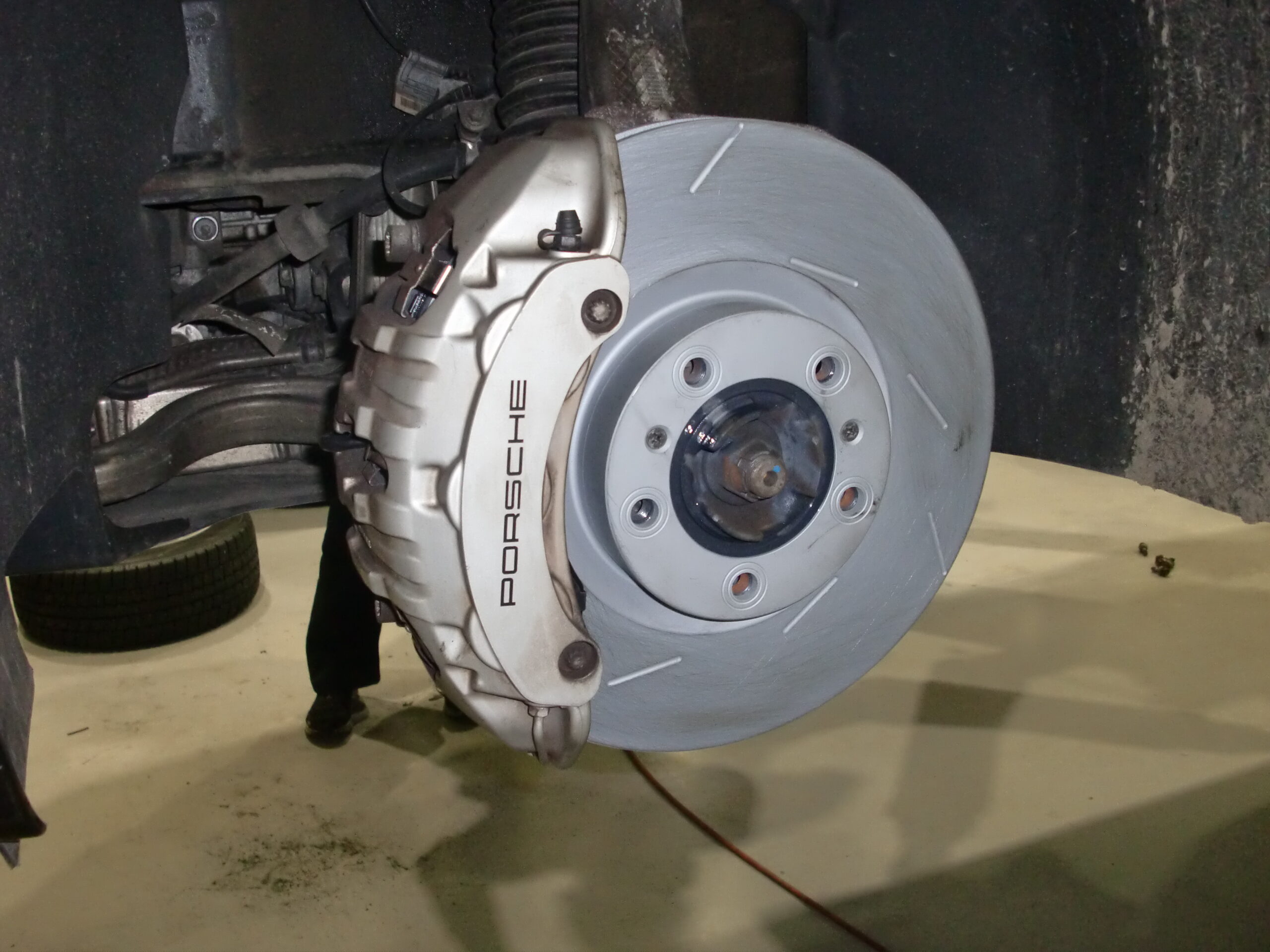 手動サイドブレーキ車両の場合、簡易的にリアブレーキディスクの歪みも判断できますが、今回はリアディスクの歪みの可能性もお伝えした上で、ステアリング側に振動が出ていることから、フロントブレーキディスクおよびブレーキパッドを交換いたします。