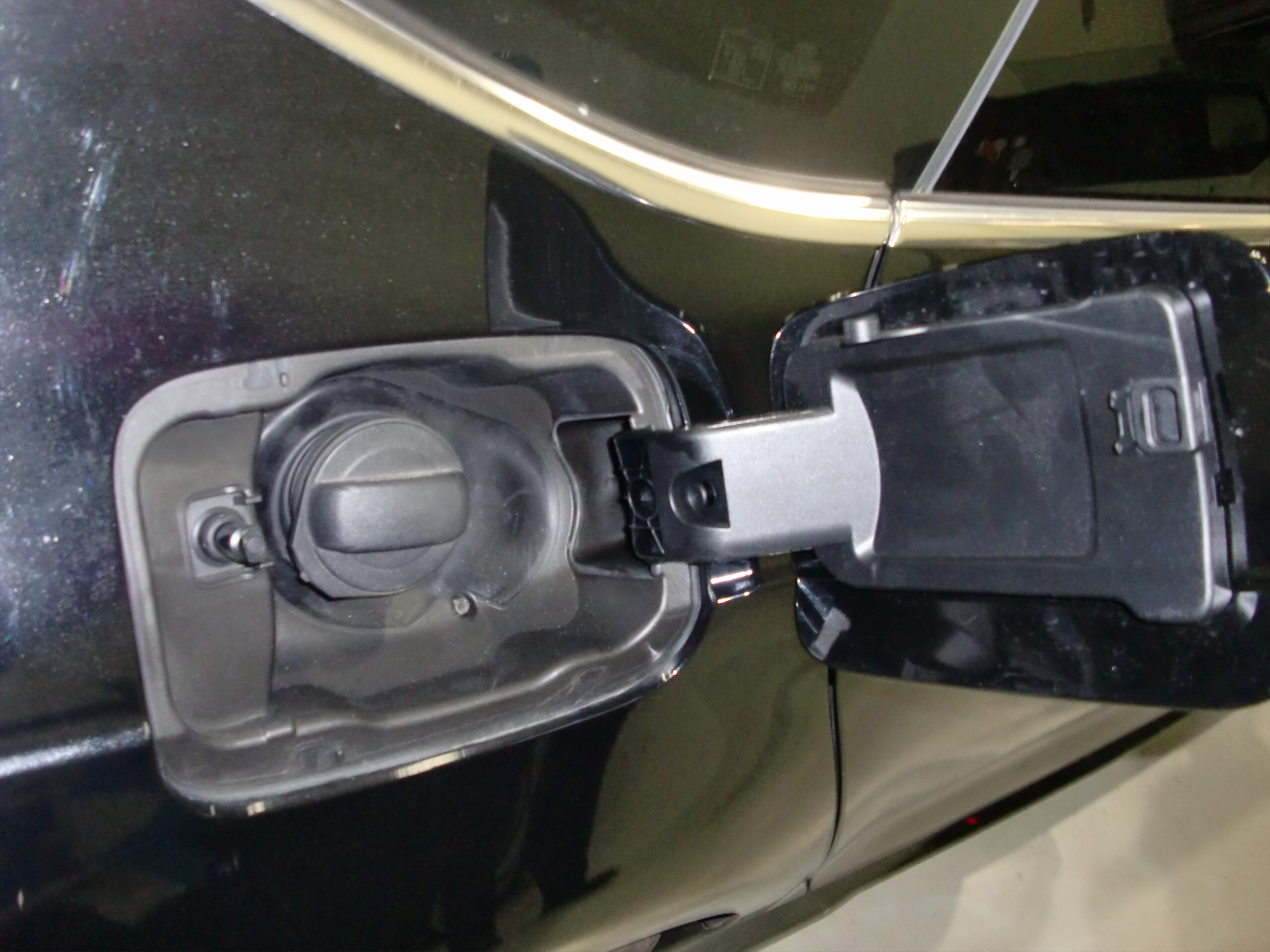 先日、「給油口が開かない」とのことでご来店いただき、点検したところロックモーターの故障が原因でした。そのためフューエルリッドを開けて応急処置をしておりましたが、このたび部品が入荷いたしましたので、あらためてご入庫いただきました。
