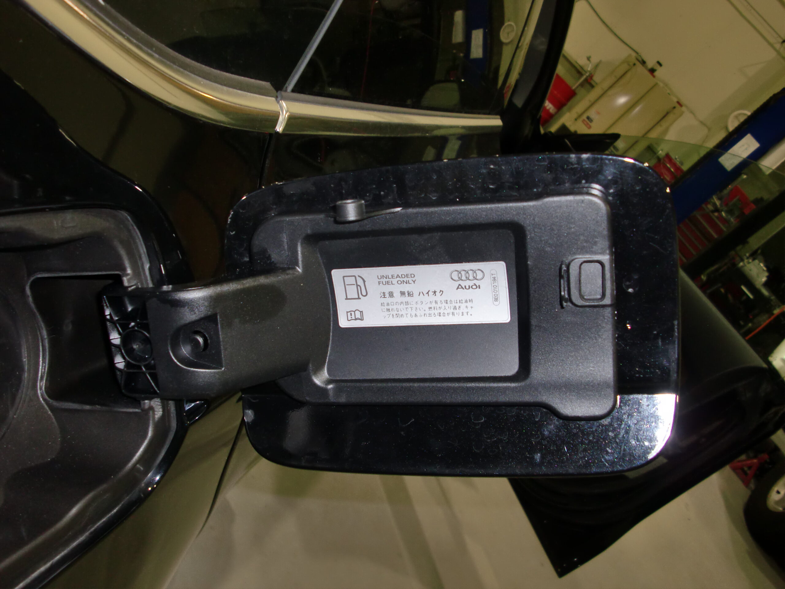 フューエルリッドにロックモーターを取り付け、ほとんど使用されることのない緊急ロック解除用の紐をトランクまで通して元通りに組み付けました。作動チェックを行い、最後にハイオクステッカーを貼り付けて作業完了です。