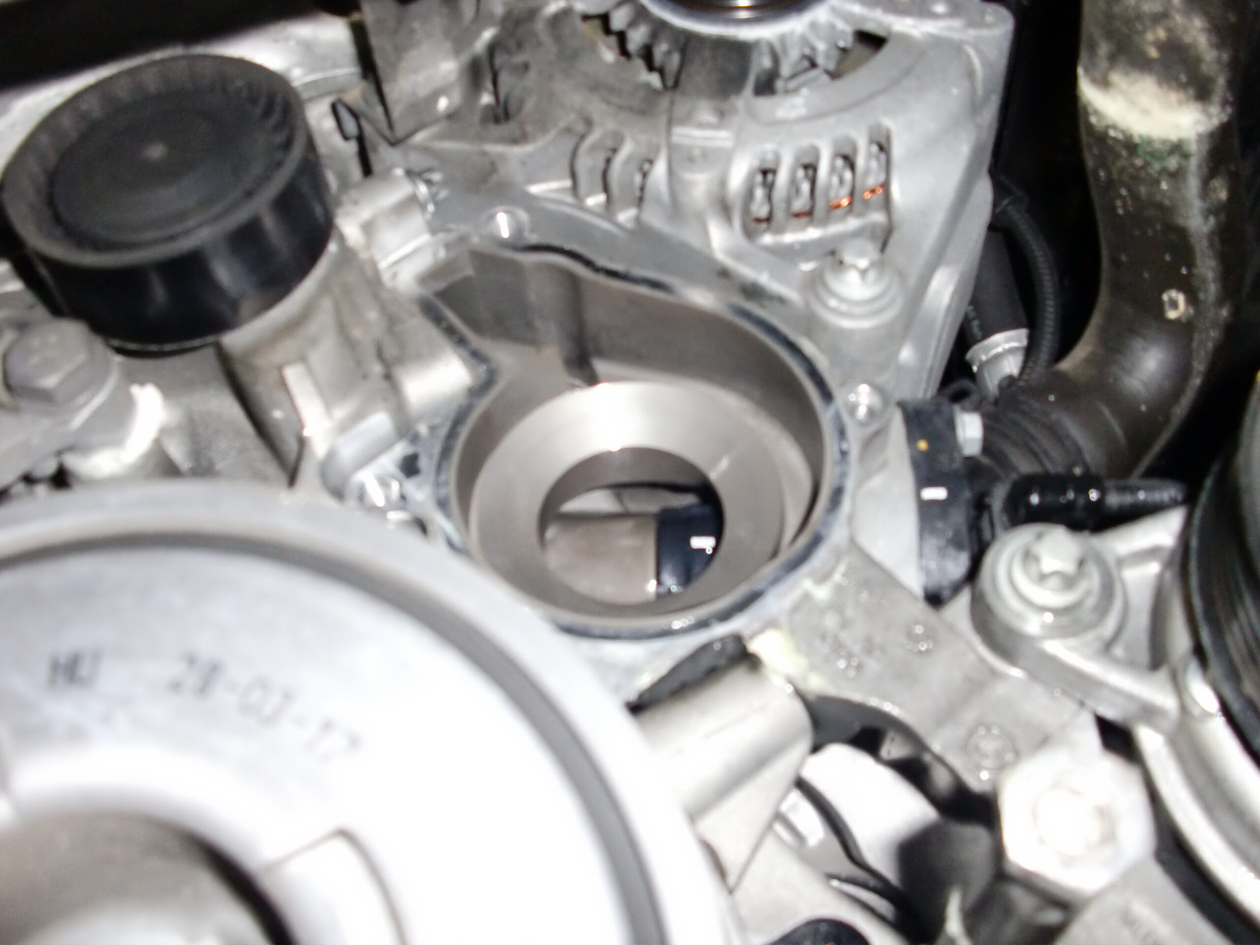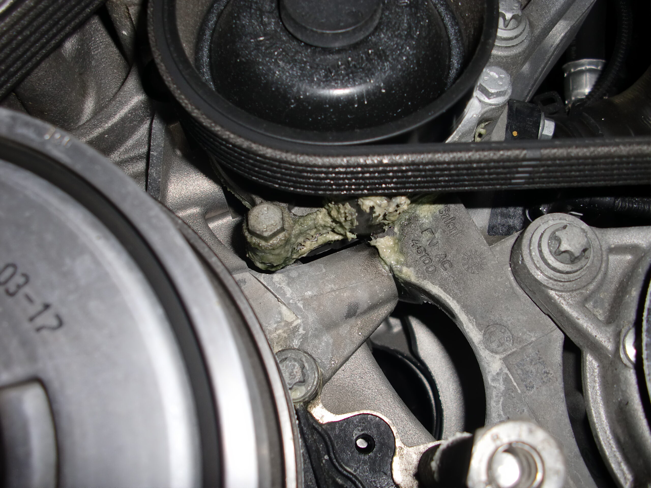 クーラントが減る原因を確認するため漏れ点検を実施したところ、ウォーターポンプよりクーラント漏れを確認できました。