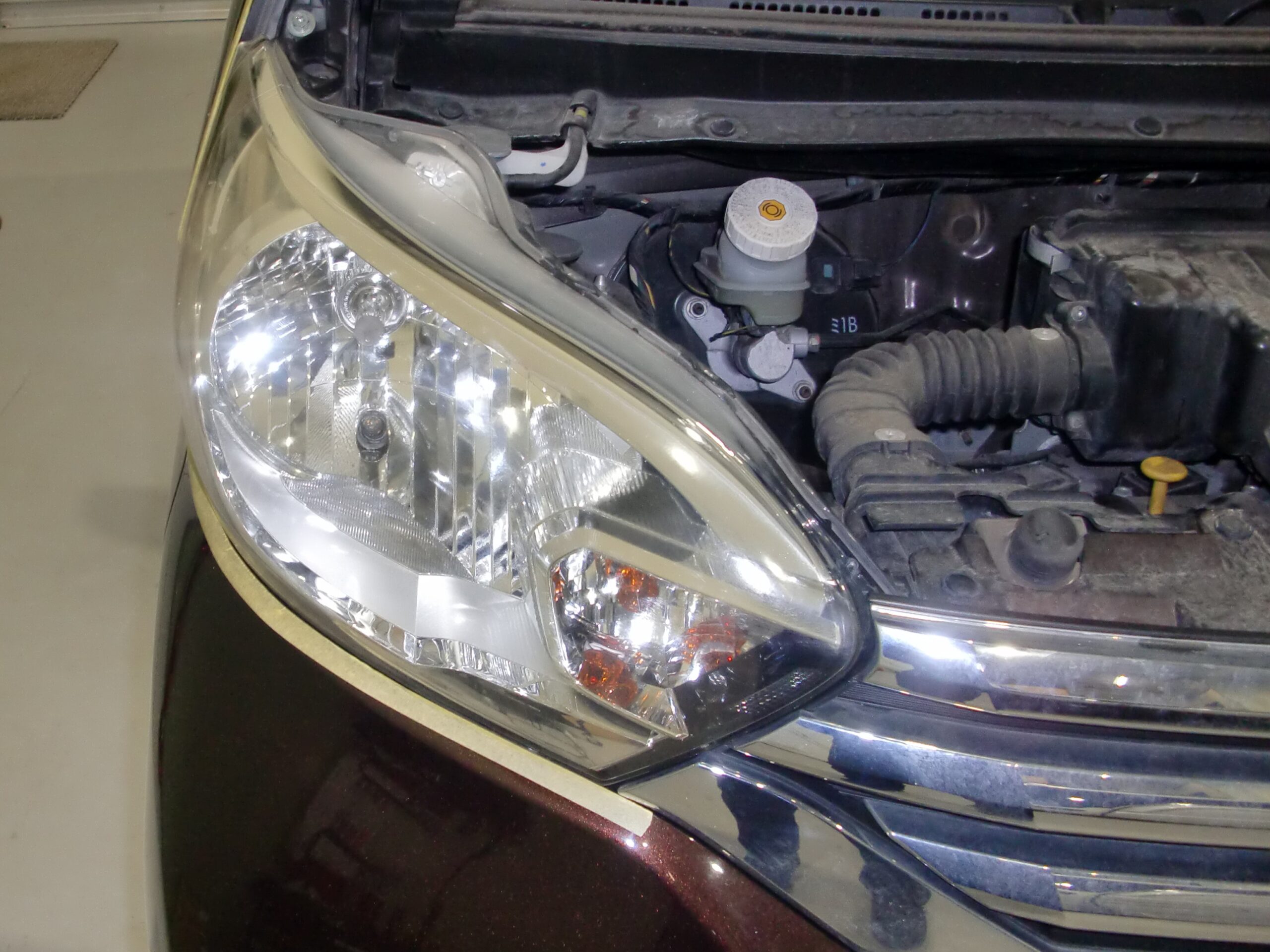 車検でお預かりしたお車のヘッドライトが、紫外線による経年劣化で黄ばんでおり、光軸検査で光度が足りず車検に通らない可能性がありました。そこで、ヘッドライトを磨いて光度の回復を試みました。
