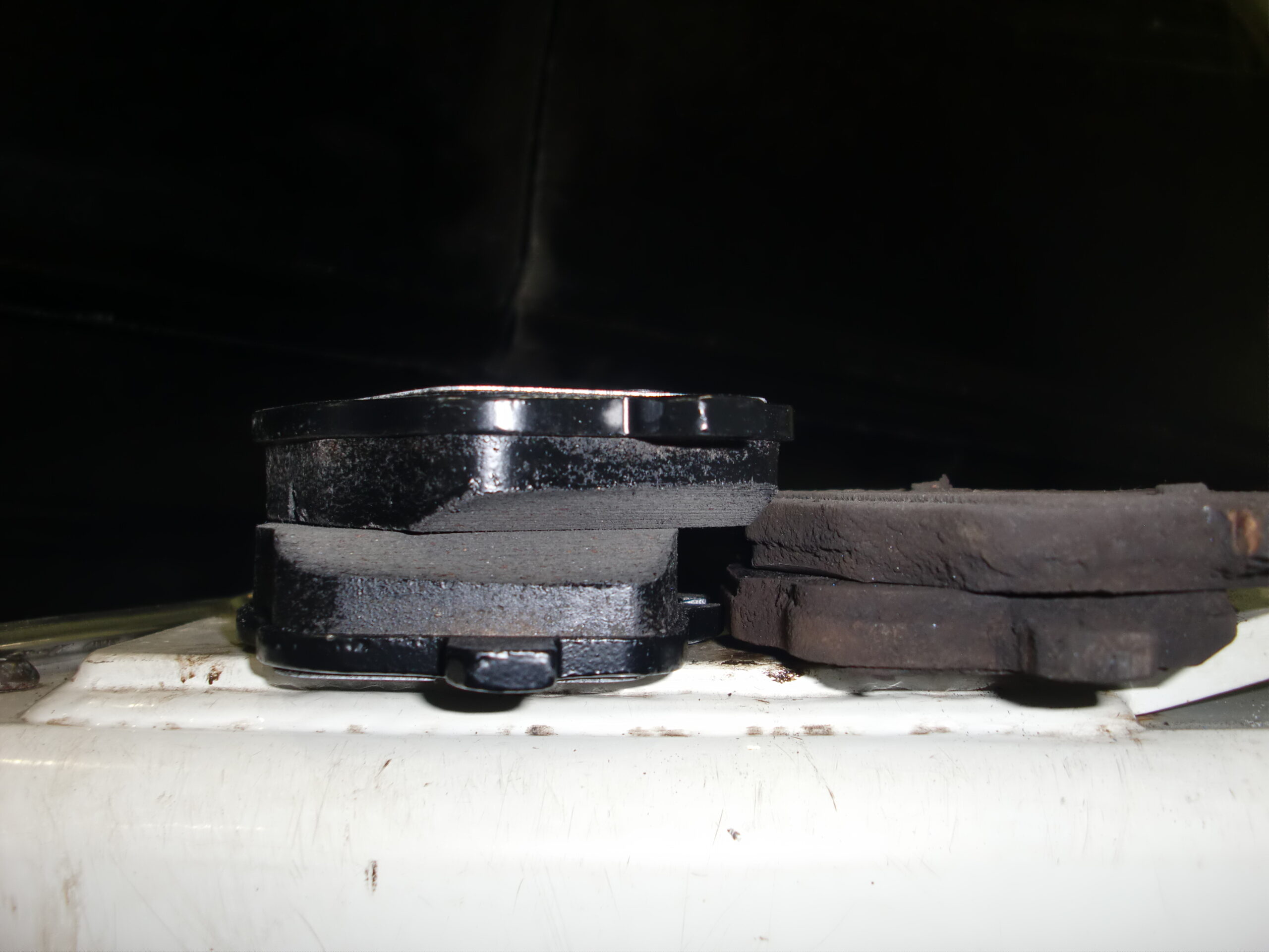 アブレーキパッド摩耗のメッセージが表示されたとのことで、先日一度点検を実施いたしました。その際に交換が必要と判断し、部品を手配させていただき、入荷後あらためてご入庫いただきました。