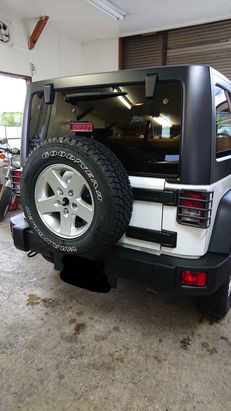 バックカメラの取り付け位置はナンバー横などに取り付けが多いですが、この車両はそこよりも上部のスペアタイヤの方が後方に位置している為、